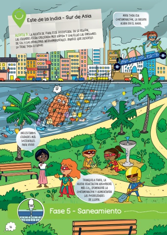 Fase 5 %u2013 SaneamientoEste de la India %u2013 Sur de AsiaAlerta 5: La alerta de Fiara est%u00e1 justificada. En su regi%u00f3n, las ciudades est%u00e1n creciendo muy r%u00e1pido y con ellas las emisiones de CO2 y los problemas medioambientales. %u00a1Parece que Desertus lo tiene todo a favor!%u00a1Necesitamos ciudades m%u00e1s sostenibles para vivir!Mira toda esa contaminaci%u00f3n, la basura acaba en el agua. Tranquila Fiara, la nueva vegetaci%u00f3n absorber%u00e1 m%u00e1s CO2, disminuir%u00e1 la contaminaci%u00f3n y aumentar%u00e1n las posibilidades de lluvia.16