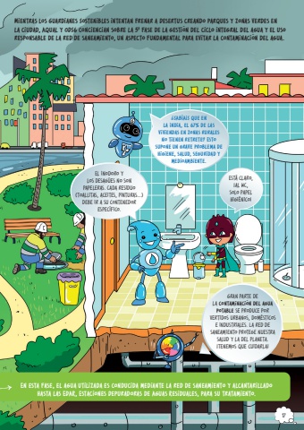 En esta fase, el agua utilizada es conducida mediante la red de saneamiento y alcantarillado hasta las EDAR, Estaciones Depuradoras de Aguas Residuales, para su tratamiento.Gran parte de la contaminaci%u00f3n del agua potable se produce por vertidos urbanos, dom%u00e9sticos e industriales. La red de saneamiento protege nuestra salud y la del planeta. %u00a1Tenemos que cuidarla! Est%u00e1 claro, %u00a1al WC, solo papel higi%u00e9nico!%u00bfSAB%u00cdAIS que en la India, el 67% de las viviendas en zonas rurales no tienen retrete? Esto supone un grave problema de higiene, salud, seguridad y medioambiente.Mientras los Guardianes Sostenibles intentan frenar a Desertus creando parques y zonas verdes en la ciudad, Aqual y ODS6 conciencian sobre la 5a fase de la gesti%u00f3n del ciclo integral del agua y el uso responsable de la red de saneamiento, un aspecto fundamental para evitar la contaminaci%u00f3n del agua.El inodoro y los desag%u00fces no son papeleras. Cada residuo (toallitas, aceites, pinturas%u2026) debe ir a su contenedor espec%u00edfico.17