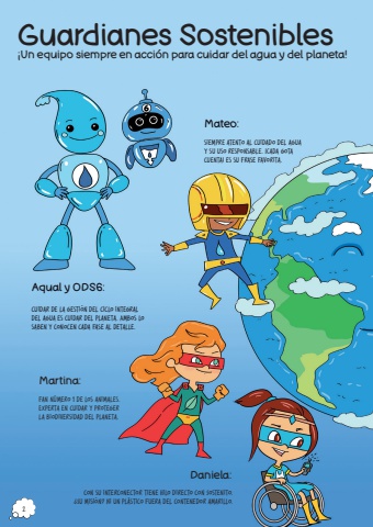 Guardianes Sostenibles%u00a1Un equipo siempre en acci%u00f3n para cuidar del agua y del planeta!Aqual y ODS6:Mateo:Daniela:Martina:cuidar de la gesti%u00f3n del ciclo integral del agua es cuidar del planeta. Ambos lo saben y conocen cada fase al detalle.fan n%u00famero 1 de los animales. Experta en cuidar y proteger la biodiversidad del planeta.con su interconector tiene hilo directo con Sostenito. %u00bfSu misi%u00f3n? Ni un pl%u00e1stico fuera del contenedor amarillo.siempre atento al cuidado del agua y su uso responsable. %u00a1Cada gota cuenta! es su frase favorita.2