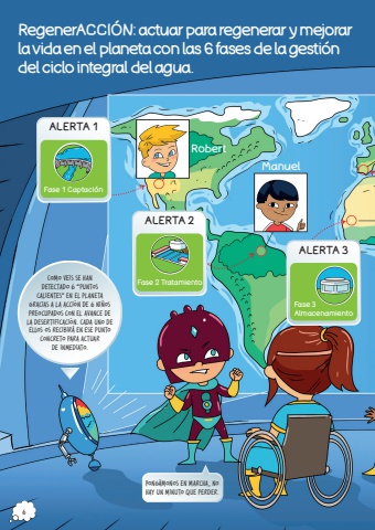 RegenerACCI%u00d3N: actuar para regenerar y mejorar la vida en el planeta con las 6 fases de la gesti%u00f3n del ciclo integral del agua.Robert ALERTA 1 ALERTA 2 ALERTA 3Fase 1 Captaci%u00f3nFase 2 TratamientoFase 3AlmacenamientoComo veis se han detectado 6 %u201cpuntos calientes%u201d en el planeta gracias a la acci%u00f3n de 6 ni%u00f1os preocupados con el avance de la desertificaci%u00f3n. Cada uno de ellos os recibir%u00e1 en ese punto concreto para actuar de inmediato. Pong%u00e1monos en marcha, no hay un minuto que perder.Manuel 6